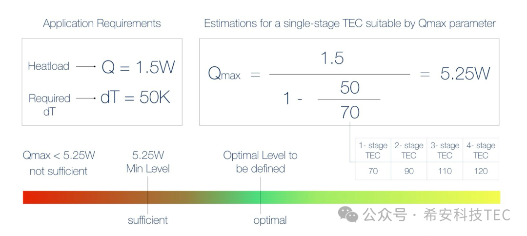 TEC தேர்வுக்கான முக்கிய தேவைகள்: சுமை Qc, இயக்க வெப்பநிலை Tc, சூடான முடிவு வெப்பநிலை Th, Dt=Th-Tc. உதாரணமாக: Qc=1.5W, Dt=50K, Qmax=1.5(1-50/70)=5.25W. இது Qmax 5.25W உகந்த தீர்வா? இல்லை, இந்த பயன்பாட்டில் 5.25 சிறிய Qmax ஆகும். Qmax பெரியதாக இருக்க வேண்டிய அவசியமில்லை, சிறந்தது. அது பெரியதாக இருந்தால், PN ஜோடிகளின் எண்ணிக்கை அதிகமாக இருக்கும், மேலும் நுகரப்படும் ஆற்றல் அதிகமாக இருக்கும். இந்த உகந்த Qmax ஐ எவ்வாறு கணக்கிடுவது என்பது மிகவும் சிக்கலானது மற்றும் மிகவும் தொழில்முறை வெப்ப வடிவமைப்பு பொறியாளர்கள் தேவை.