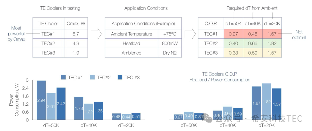 பின்வரும் படத்தில் காட்டப்பட்டுள்ளபடி, TEC இன் மூன்று குழுக்களைத் தேர்ந்தெடுத்துள்ளோம், வெவ்வேறு Qmax, ஆனால் அதே பயன்பாட்டு சூழல். TEC# 1 இன் COP மிகக் குறைவாக உள்ளது, அதே நேரத்தில் அதன் Qmax மிகப்பெரியது.