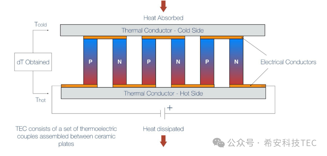 பின்வரும் படத்தில் காட்டப்பட்டுள்ளபடி தெர்மோகப்பிளின் இரு முனைகளிலும் வெப்ப கடத்திகள் சேர்க்கப்படுகின்றன: ஒரு முழுமையான TEC உருவாகிறது. TEC இயங்கும் போது, மேல் மேற்பரப்பு வெப்பத்தை உறிஞ்சும், இது குளிர் முடிவு என்று அழைக்கப்படுகிறது, மேலும் உறிஞ்சப்பட்ட வெப்பம் Q0 ஆகும். கீழ் மேற்பரப்பு வெப்பத்தை வெளியிடுகிறது மற்றும் வெப்ப மேற்பரப்பு என்று அழைக்கப்படுகிறது, வெளியிடப்படும் வெப்பம் Q1 ; Q1= Q0+Qtec